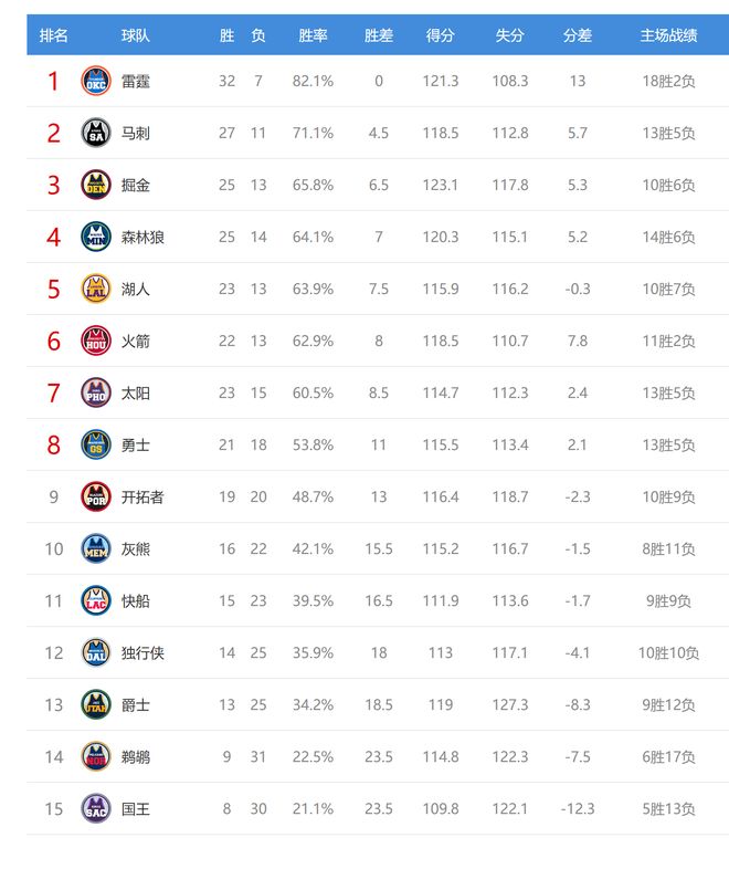 今日比賽后西部排名沒有變動,只是各隊之間的勝場差有所變化。